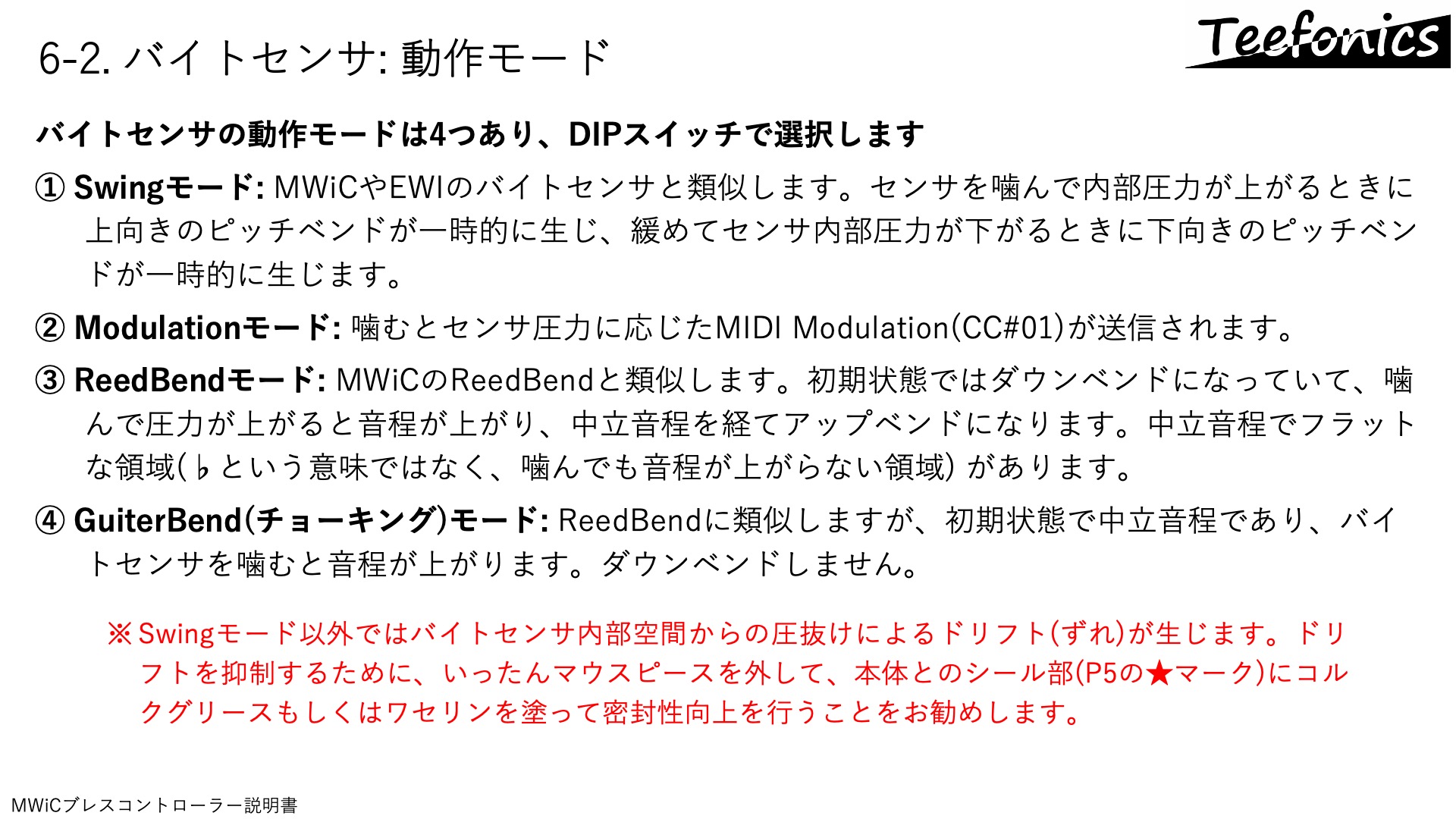 - バイトセンサによる音程表現には複数のモードを備えており、演者の好みに応じたコントロールが可能です。