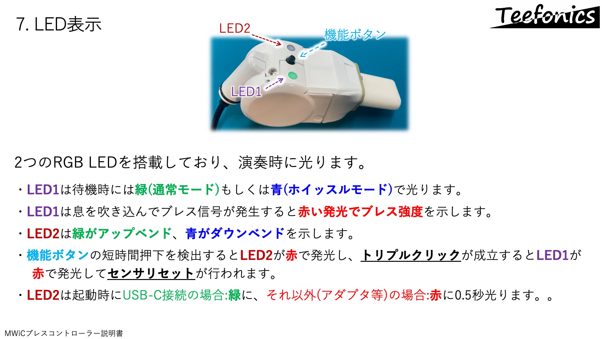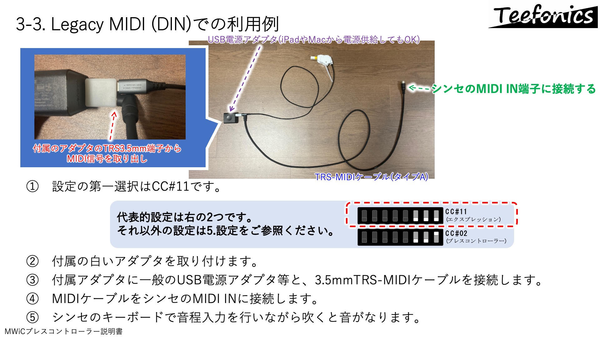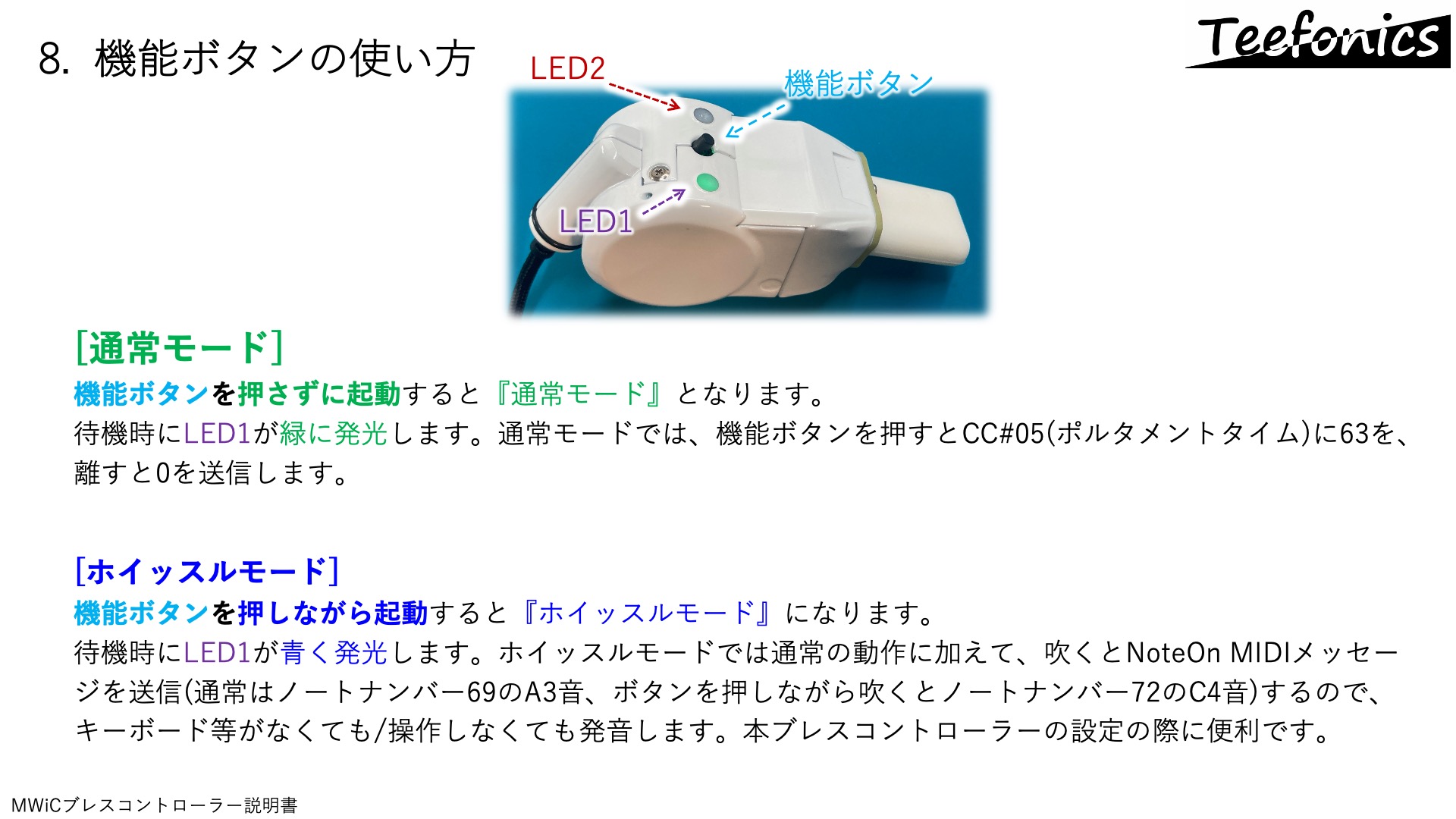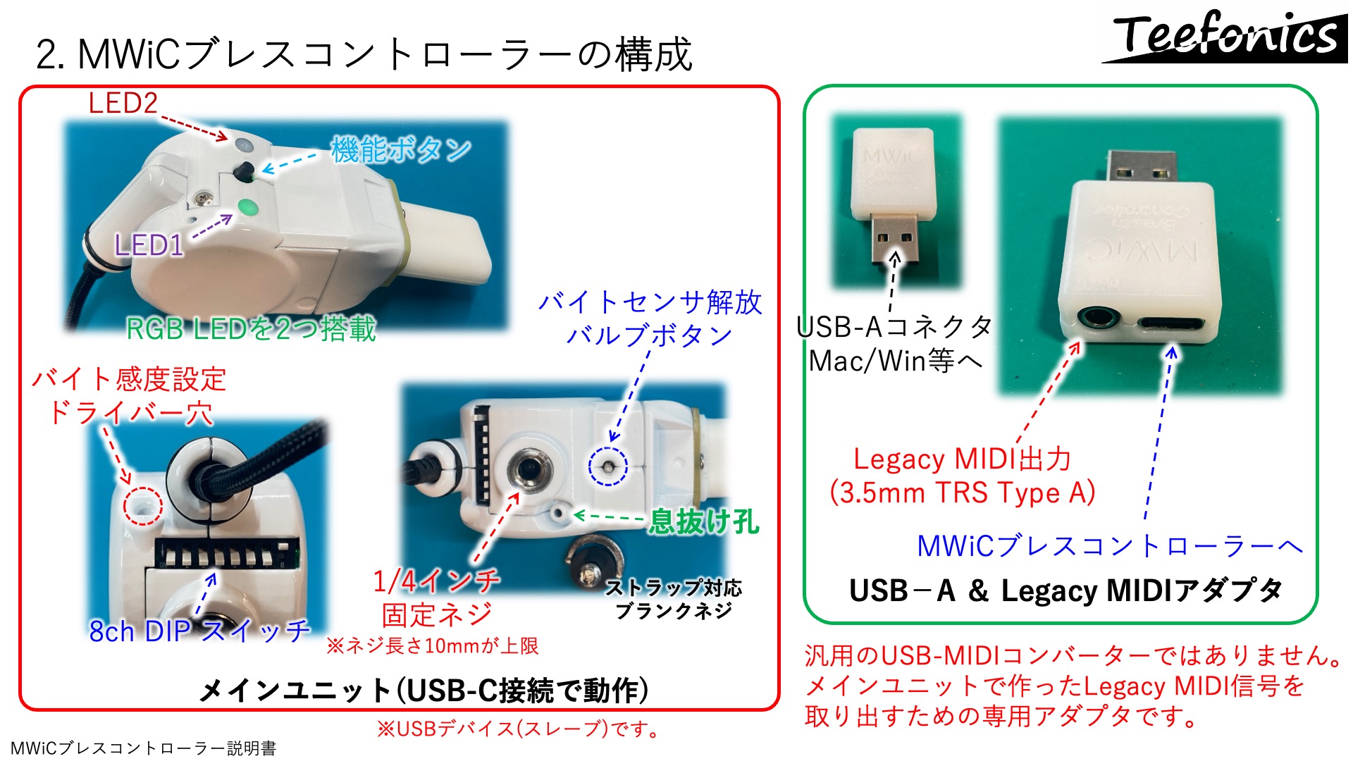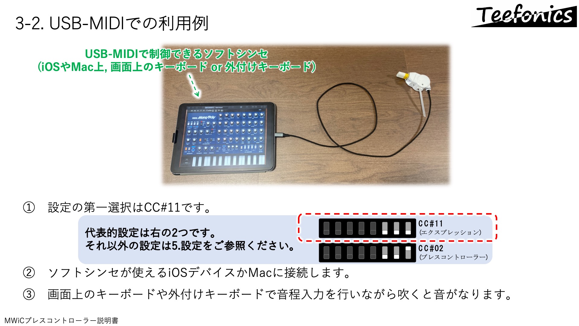 - MWiCブレコンはUSBデバイス(スレーブ)として機能します。USBホスト(パソコンやiOSデバイス、USBホスト機能を備えた高機能シンセ)に接続して利用可能です。